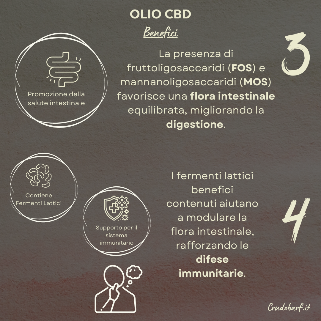 Data la presenza di fruttoligosaccaridi (FOS) e mannanoligosaccaridi (MOS) favorisce la salute dell'intestino, migliorando la funzionalità digestiva e contribuendo alla crescita di una flora intestinale sana.